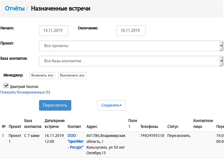 Поддерживаются фильтры по дате начала и окончания встречи, проекту, базе контактов, оператору.
